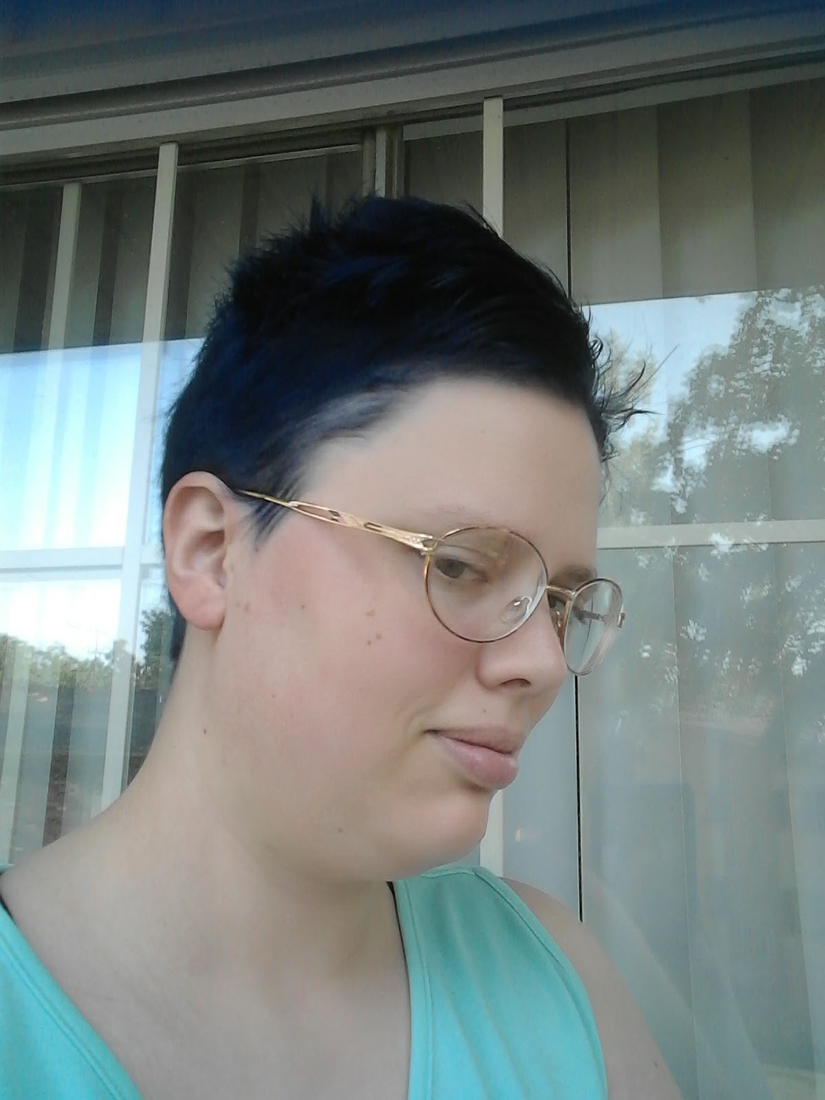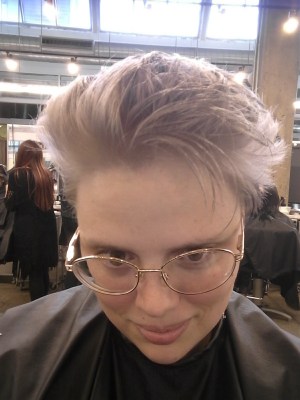 As you can see, I got my hair redone.  It\’s quite short, but I mainly used this picture because it conveys how blue they got my hair.  This is actually darker than we were aiming for, but the professionals were kind of expecting me to wash it in warm/hot water a few times, and that would make the color closer to what I wanted… which was the color of my wedding dress.  Chris (my spouse) actually lent me the scrap of the dress fabric he carries so they\’d have a color reference.