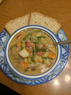 After we did the counseling, we went home and started work on one of my favorite dishes these days: beef stew.  In general, my meat consumption is fairly low, and is mainly chicken and ground bison, so steak, stew meat, and other less common meats are a real treat.  So Chris has started making beef stew on occasion, using stew meat from a local farm with the Animal Welfare Approved certification.  The meat is therefore cruelty-free and extra-delicious.  However, the stew itself requires a lot of prep work, particularly since when he makes it, it tends to be a double and triple recipe. So Chris redeemed one of the \”give me a hand with this\” coupons, and I helped him chop a whole lot of fresh vegetables.  Carrots, onions, potatoes, green beans, and celery all went in, much of it from a local farm market.  The result was exceedingly delicious, and I may have eaten a bit too much of it when it was done.  The rosemary bread Chris had baked the day before was a really tasty complement, too.