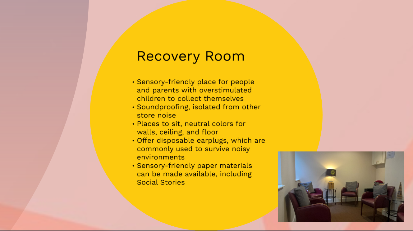 My additional suggestions for a room like this include offering disposable earplugs, which are a common assistive technology for people with sensory sensitivities, and placing copies of the aforementioned sensory map and Social Story there.