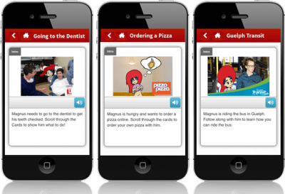 The \”cards,\” or sets of instructions, come in categories like Shopping, Personal Care, Leisure, Social, Food, and Travel. They are all free, and written in very simple English. You can download cards you like, or cards that are most relevant to your life. Some of these cards are from Canadian or even British organizations, so it\’d be wise to check the cards before downloading them.