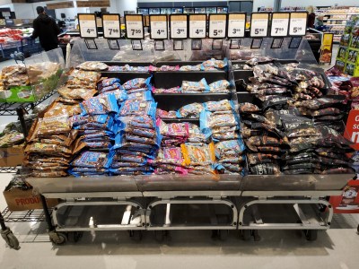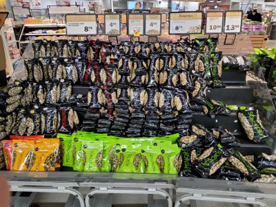 Did you wonder where the bacon was? Worry no more, there\’s a whole aisle for it. Sunday, Canadian, and streaky, it\’s all here. Various brands and price points, and varying levels of fattiness.